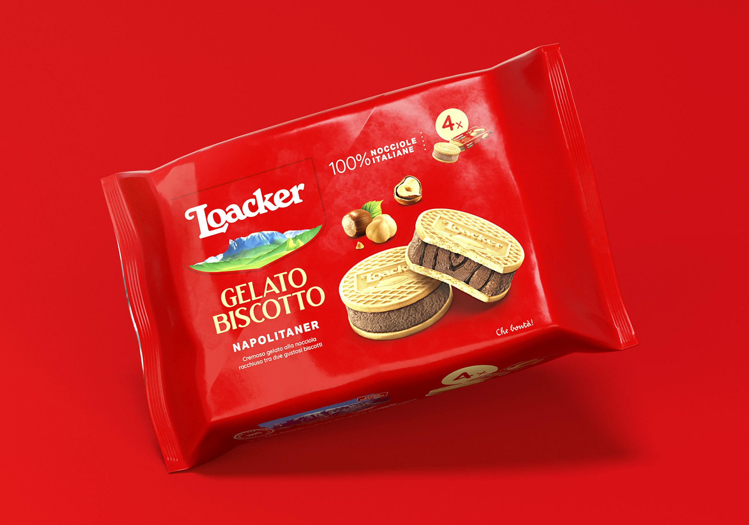 The hazelnut bestseller in red: Loacker's Napolitaner specialty converted into an ice cream sandwich. The genuineness of Alpine milk: all nature purity and the full Loacker flavor.