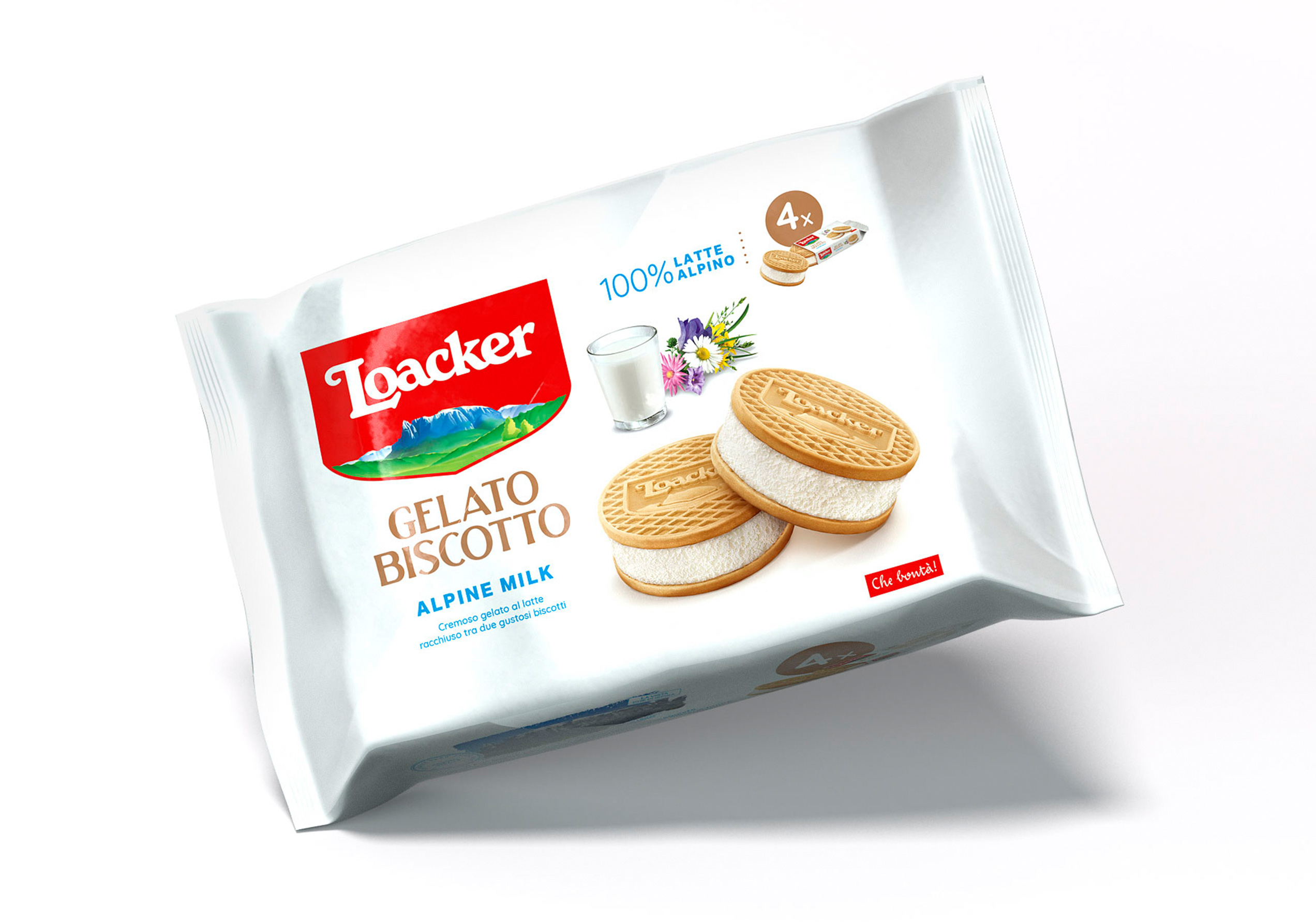 Summer is wearing Loacker colors and flavors. An unmistakable pack to introduce the new product that combines Loacker's deliciousness with Sammontana's mastery: velvety ice cream nestled between two delicious cookies.